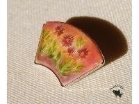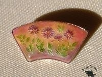 *菊の花をちりばめた帯留めです。背景は茜色のグラデーションです。帯留め用の枠に入っているので帯が傷つきません。