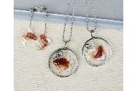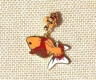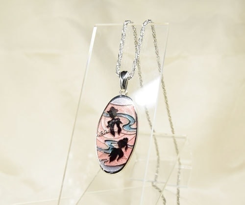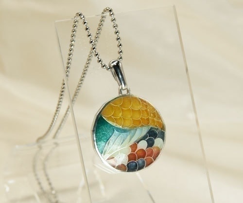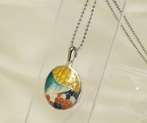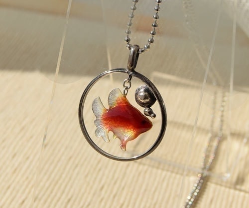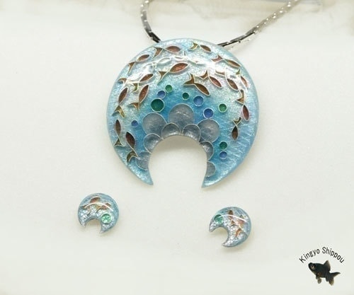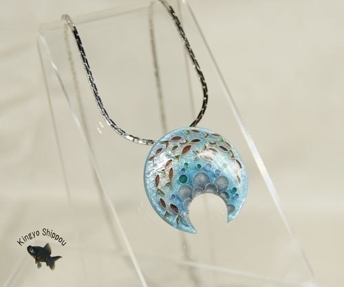 トップの輪は950銀の丸枠に純銀の水玉、金魚は純銀の板を切り抜き後七宝加工