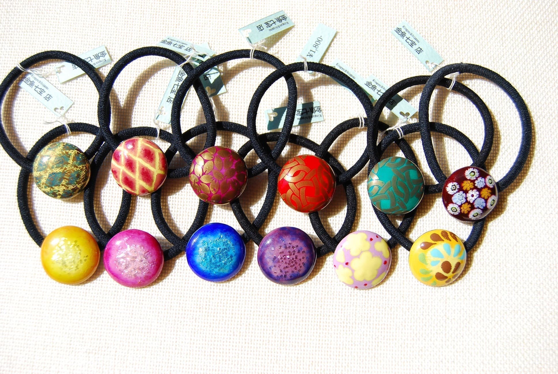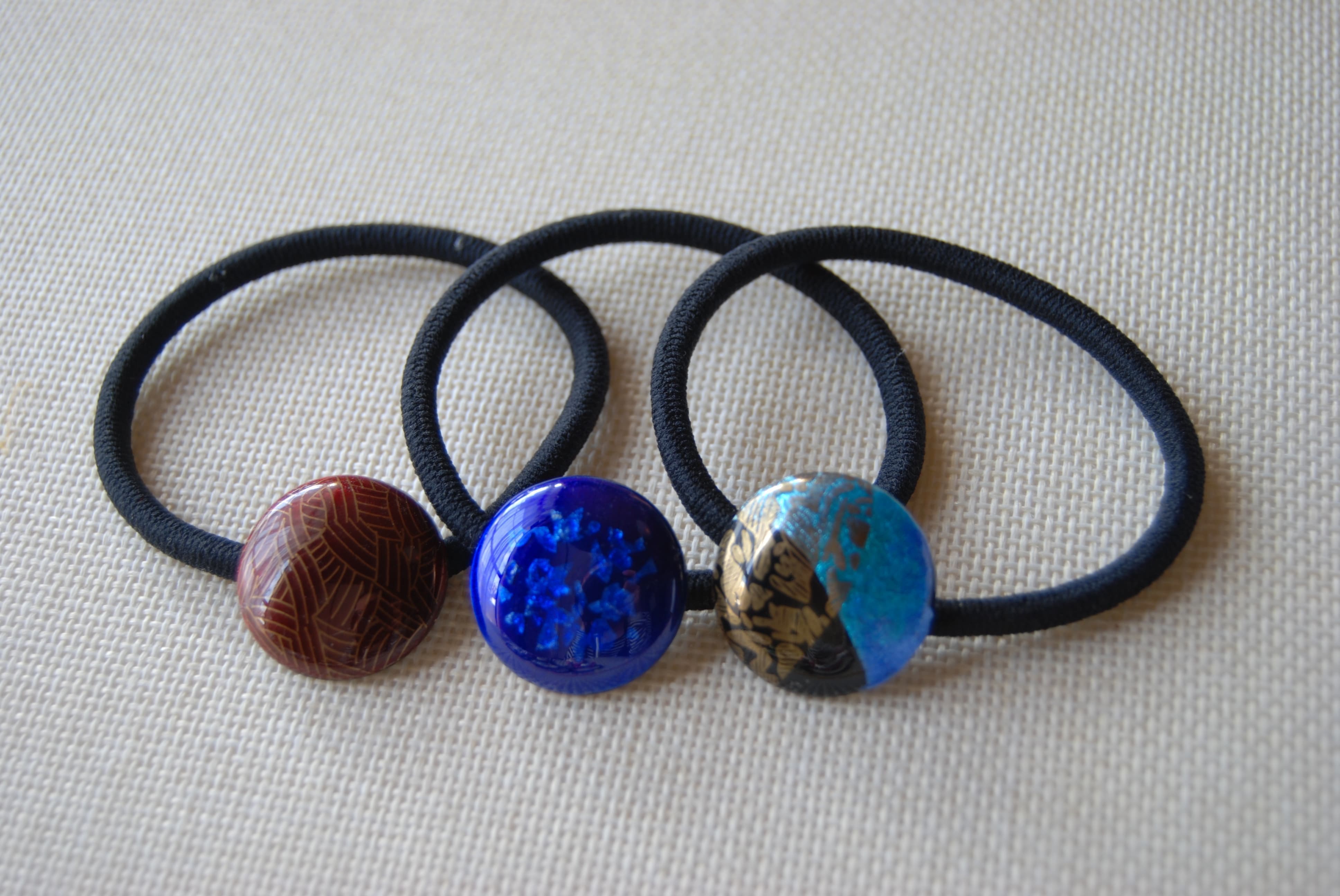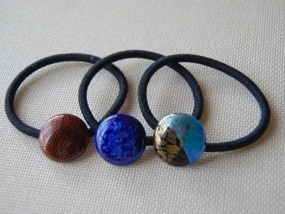 *下地に銀箔を仕込み、七宝の透明色を使った髪留めゴムです。